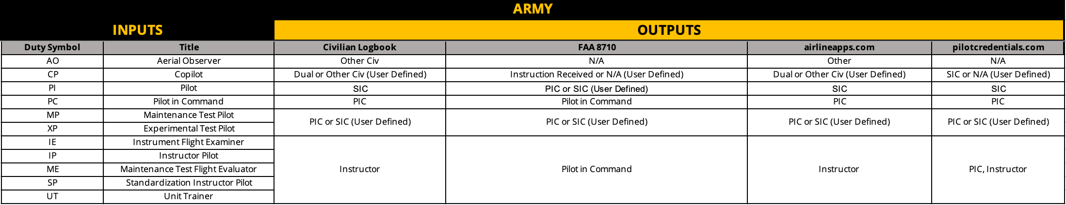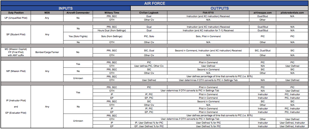 Neither the Federal Aviation Administration nor commercial airline industry publishes guidelines for converting military flight hours to civilian time. We’ve compiled the tables below by analyzing FAA regulations and interpreting various publications to determine the most effective method for re-categorizing military time. MilKEEP has built its patent pending system and method based on the following rules you see below. Begin on the left and trace the path of your specific situation to see how MilKEEP converts your inputs for our various formats.